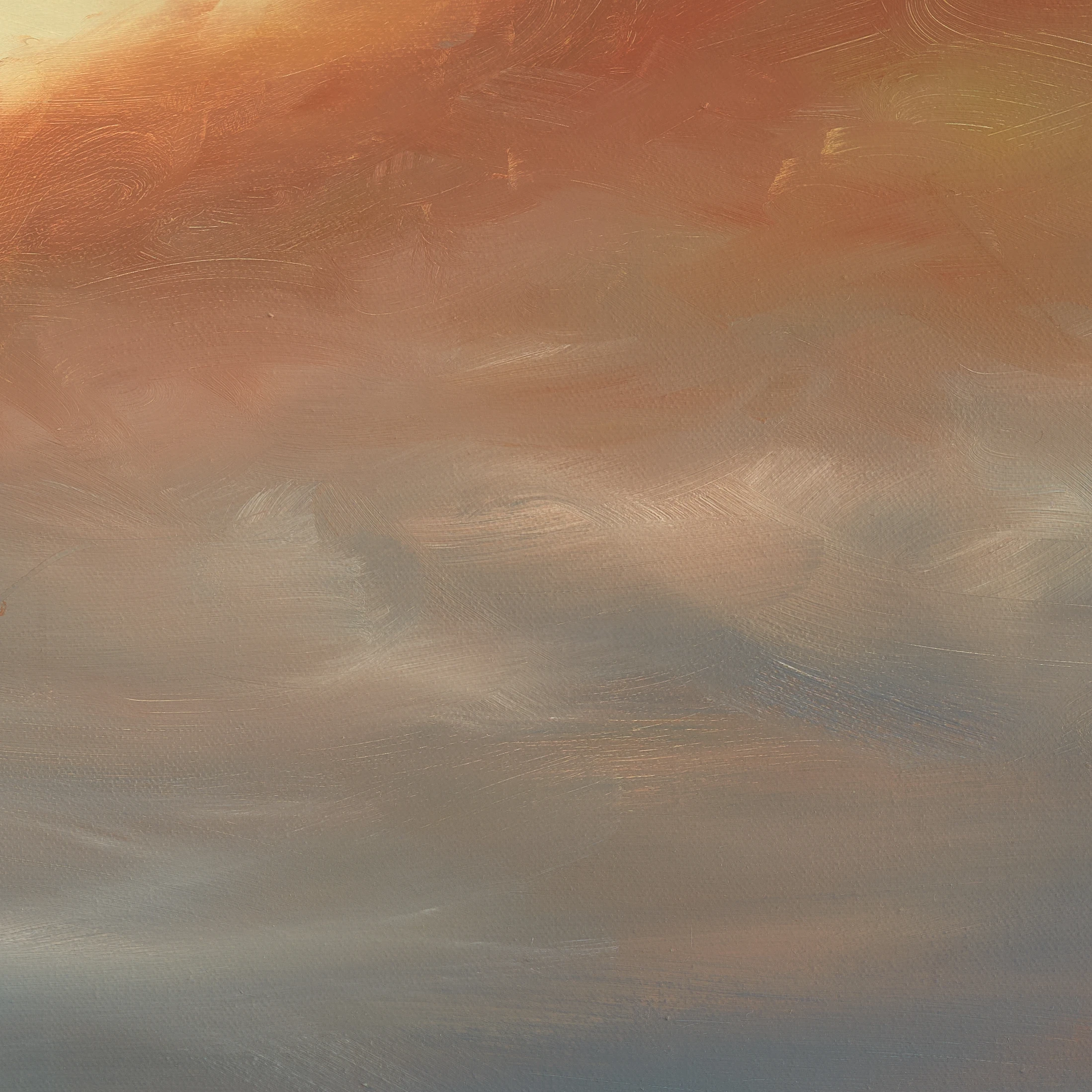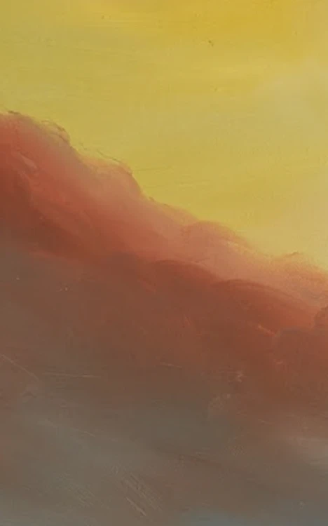 I think of this work as art that speaks quietly but with meaning. It is a space that allows us to experience the subtle interplay of light, colour and texture, all a mirror of inner states. Inspired by a dramatic interplay of colour and movement between the sea and sky, I feel a sense of awe for nature’s power. I opted for bold, short, gently circular brushstrokes to depict the sky, using a mix of deep blues, grays, and hints of red to convey movement. Various shades of horizontal blues give the painting a dynamic quality, while a simple band of sunlight on the horizon reflects the light at the top of the painting. The light filtering through the expressive cloud formation and the subtle brushwork creates a mood that lingers on even after repeated viewing.