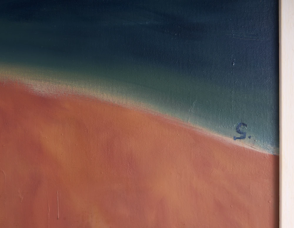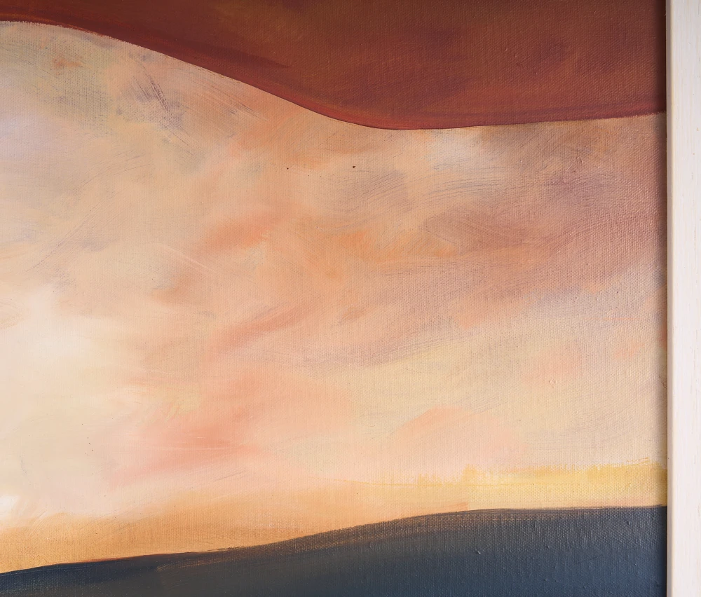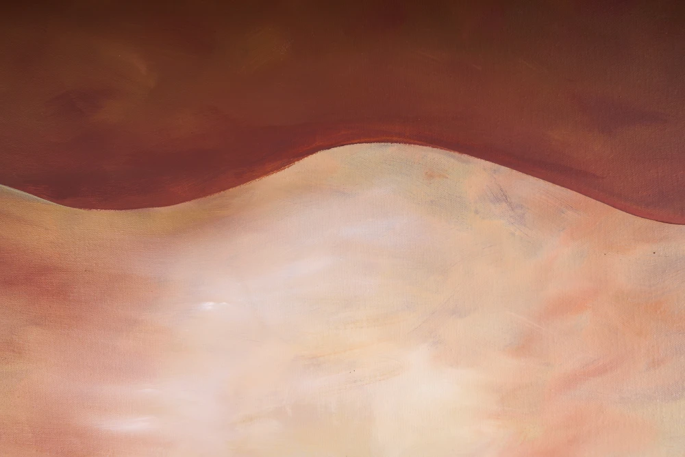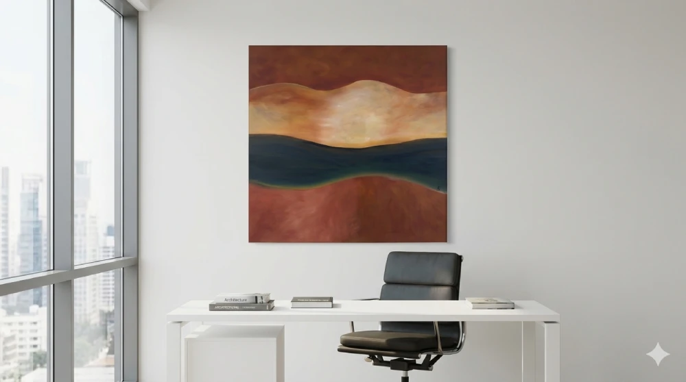 This work invites viewers into a contemplative space where earth and sky converge in a silent dialogue. The rich, earthy reds suggest a deep-seated passion or the heat of a setting sun, while the cool, deep blue-green band offers a grounding sense of peace and profound depth. This piece is not merely a study of color; it explores the emotional layers we carry within us. Each horizontal band represents a different state of being, from the vibrant intensity of our active desires to the calm, dark depths of our private reflections. Hanging this in a home or office creates an immediate focal point of serenity and balance.