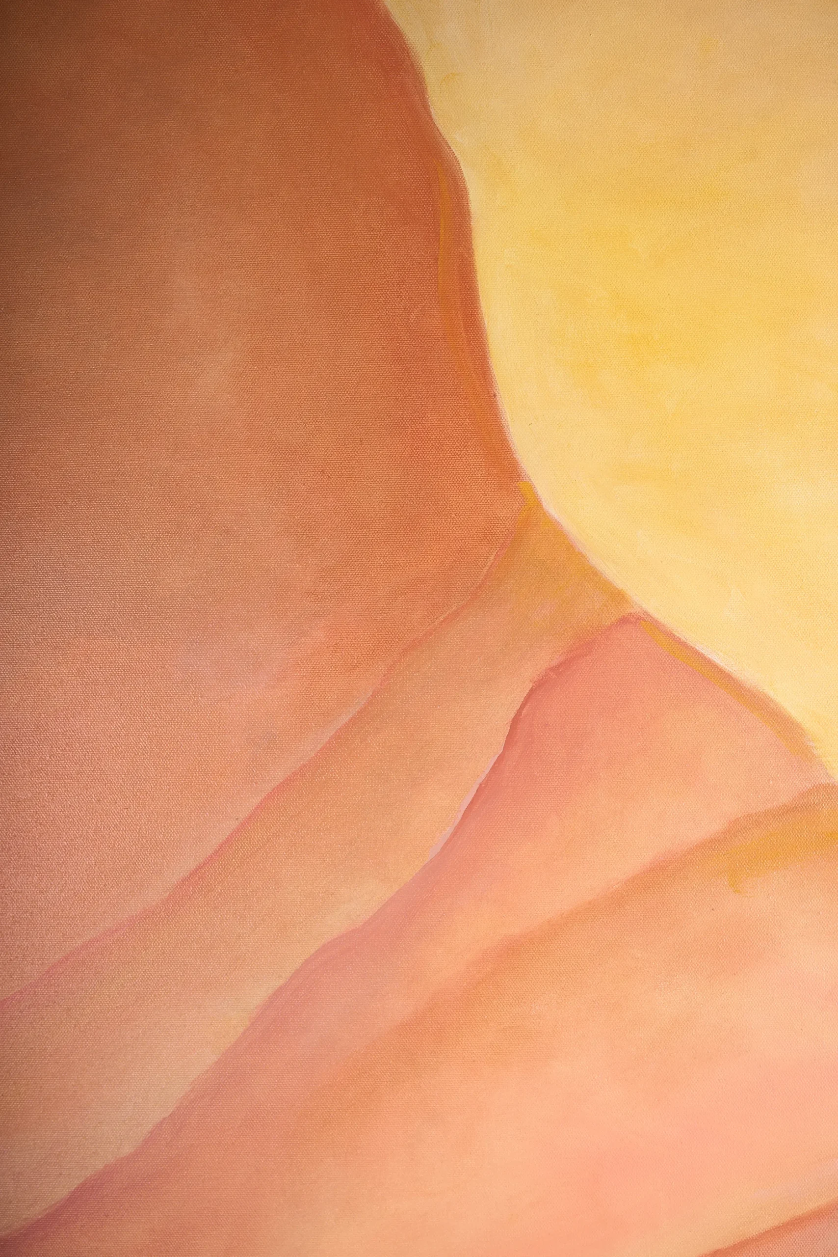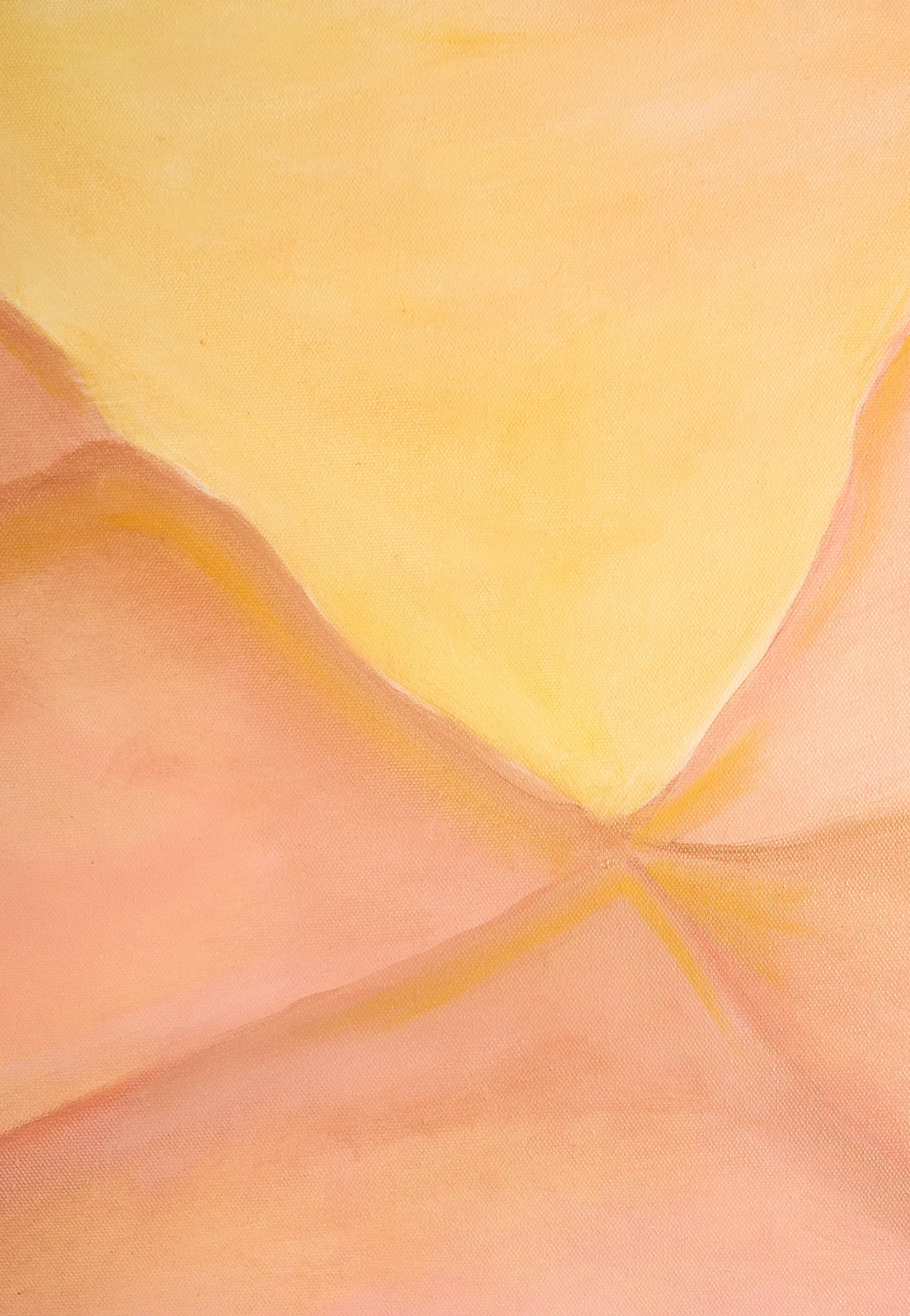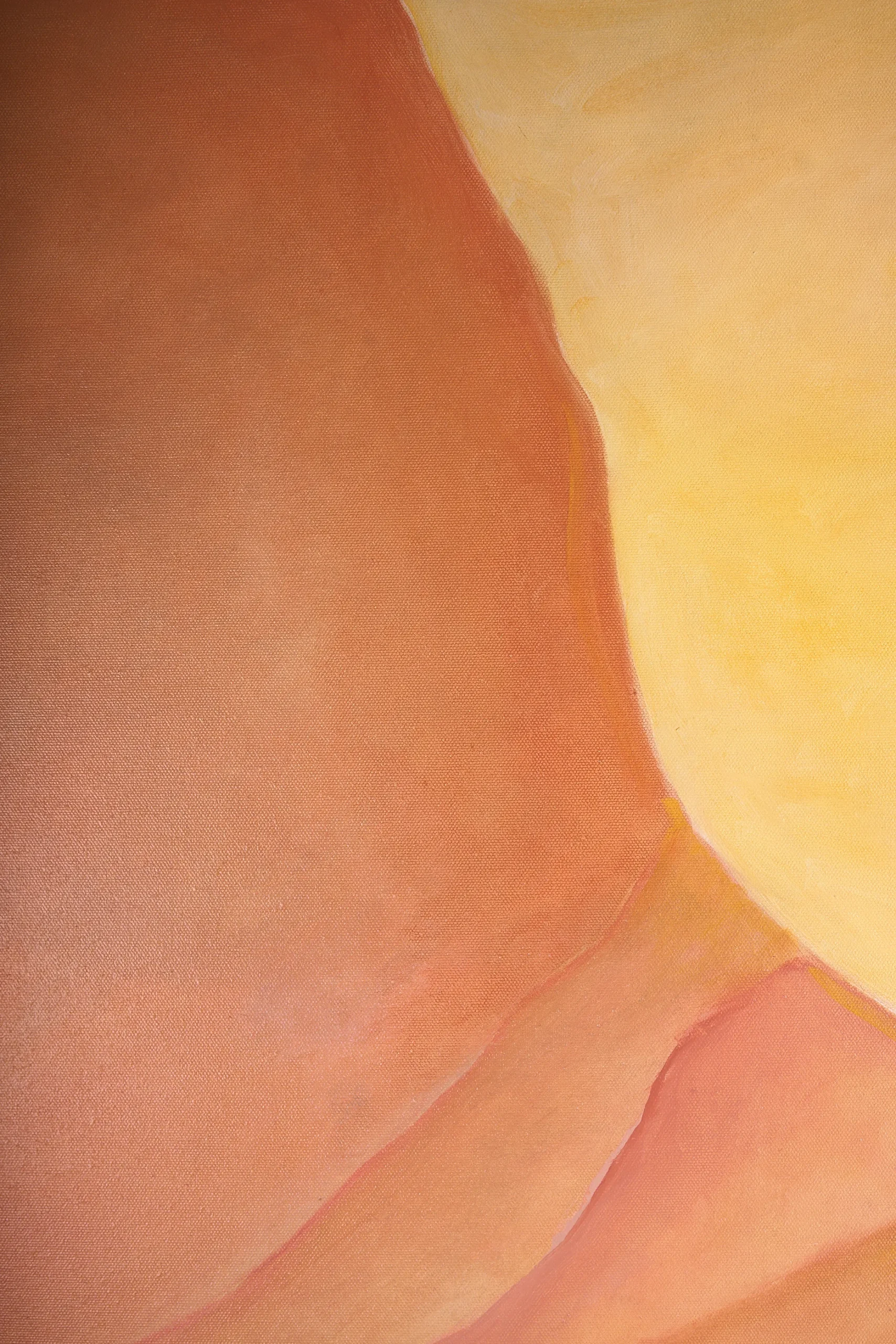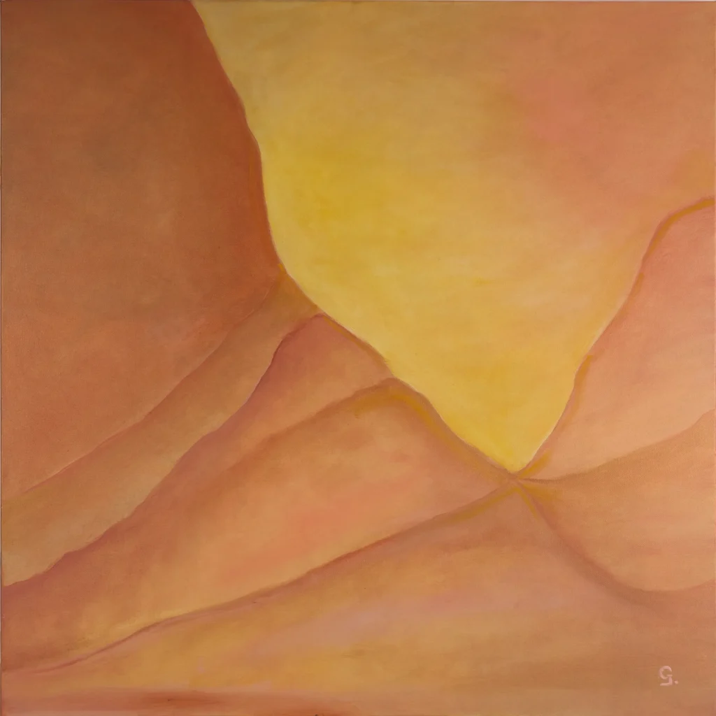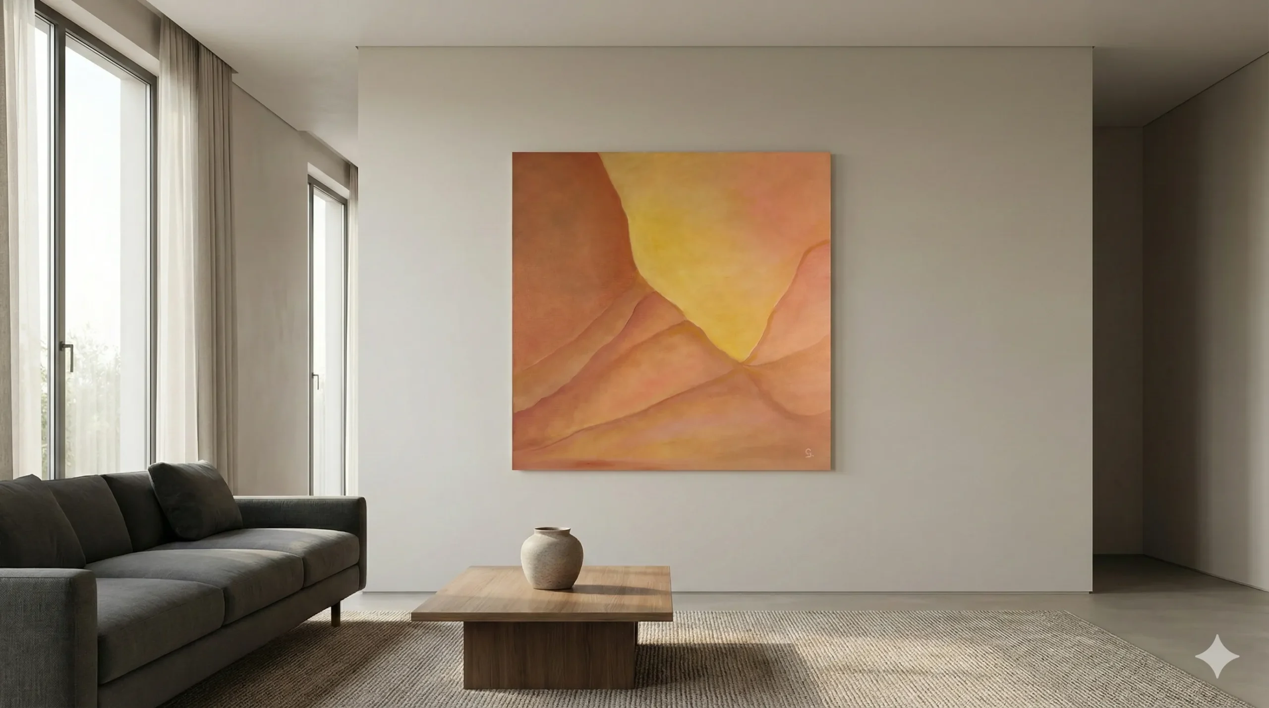 Using a palette of rich terracotta, soft ochre, and sun-bleached creams, this abstract composition mimics the natural erosion and layering of natural formations, perhaps the sides of hills.