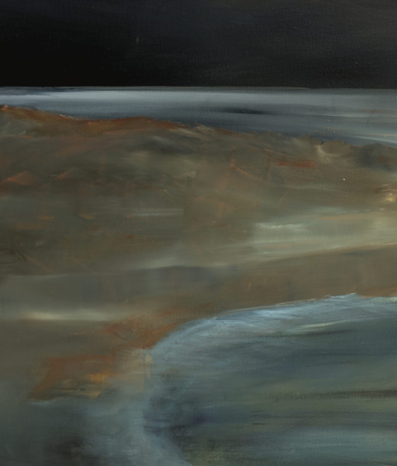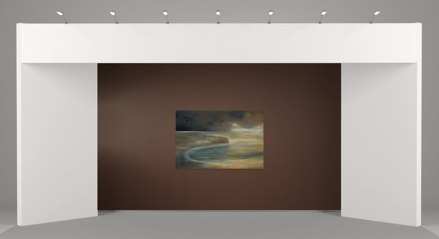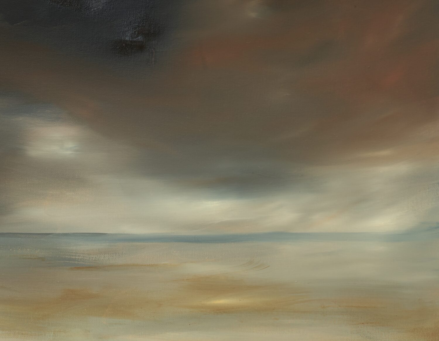 The sun, the sea, the land, the wind, the clouds have been and are in a state of perpetual contact. From the artist’s point of view they are the first spark of inspiration, the basis for the mind to explore and manipulate. In this work I opted for a remembered coast in a stormy setting. The palette is muted, the patterns simplified. the sun barely hinted at. I wanted no human presence, no sign of human life or construction. This is nature as it may have been at the beginning of the world as we know it. I invite you to let the scene connect with your memories of seasides, the memories you recall, their effect on your inner thoughts.