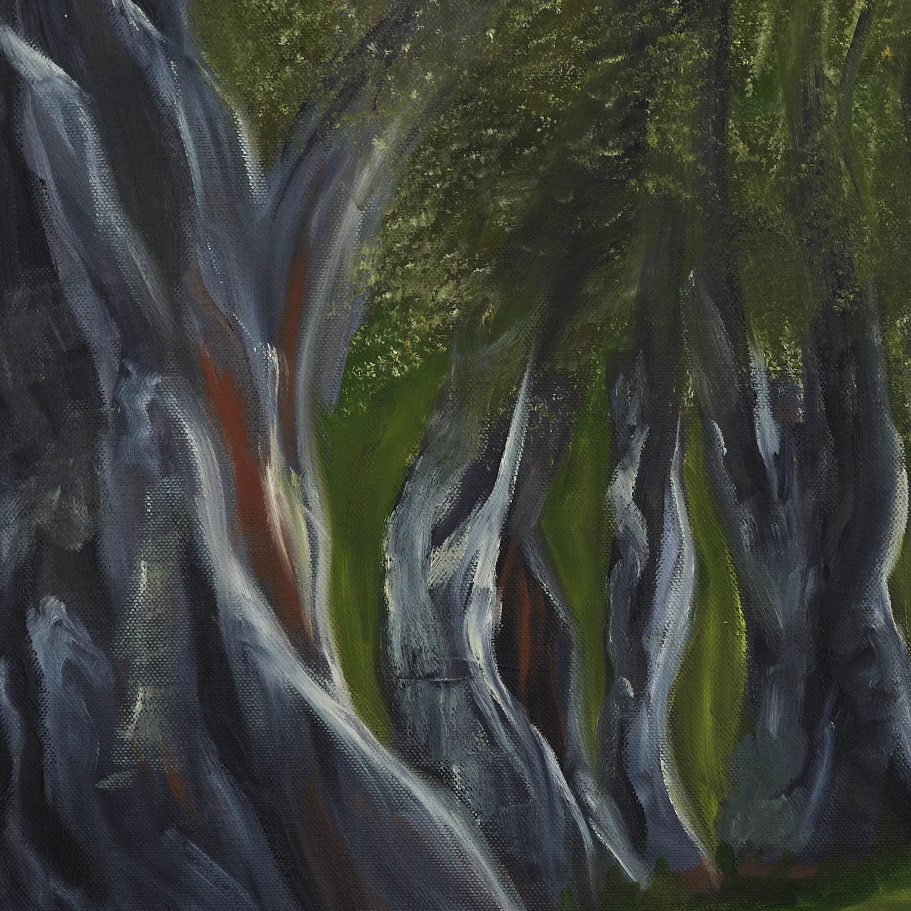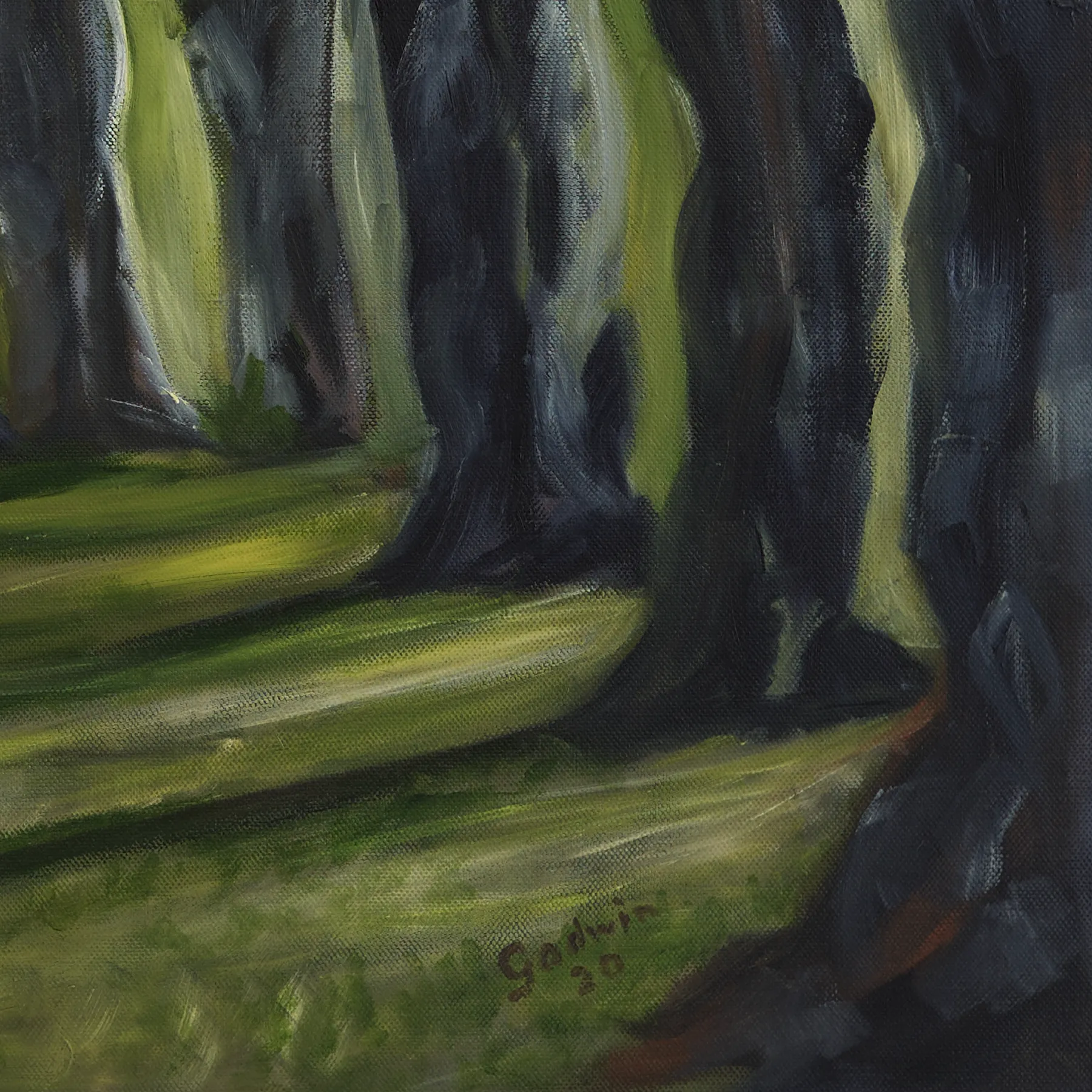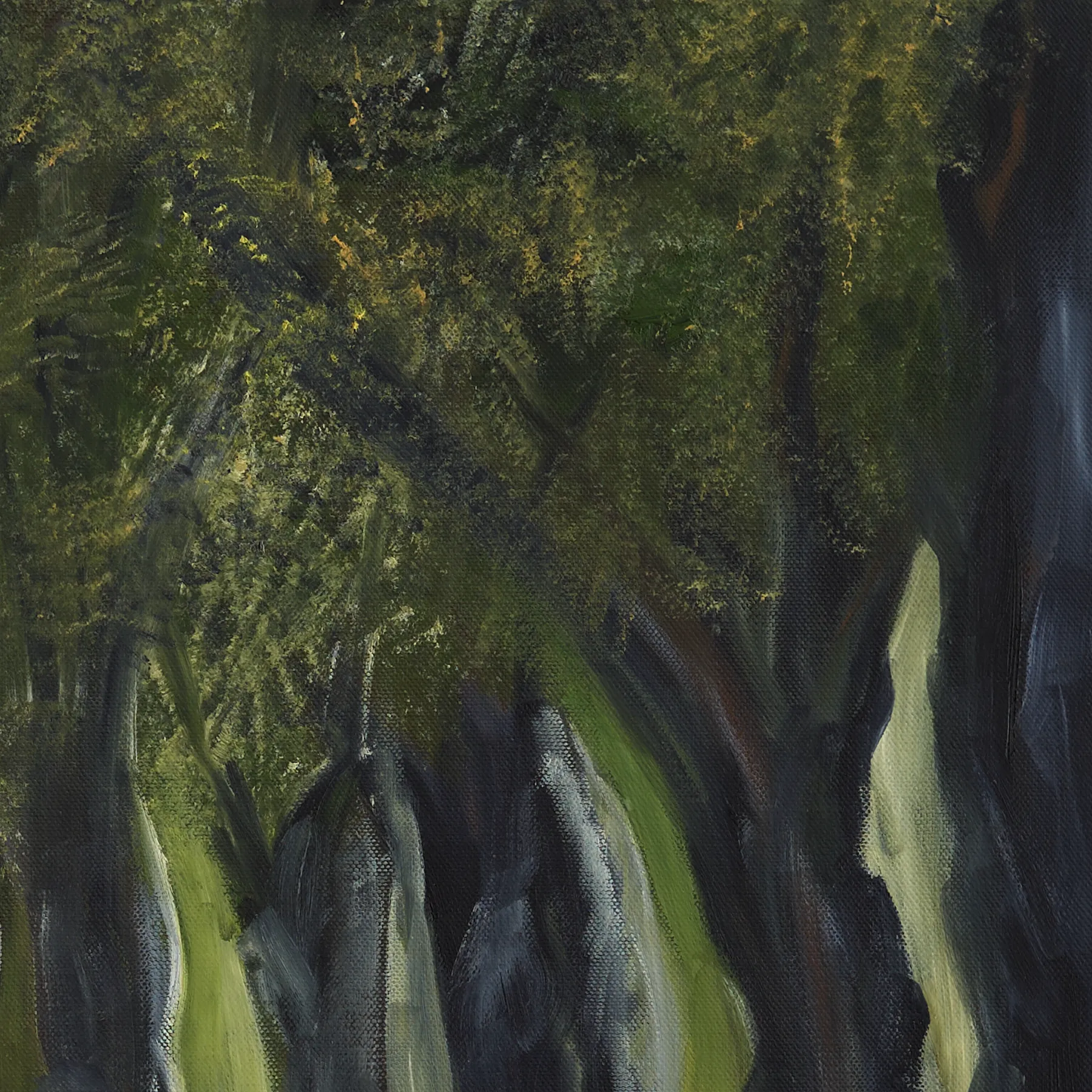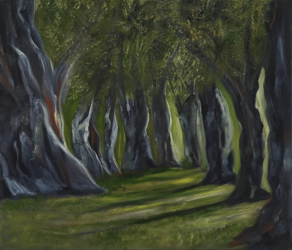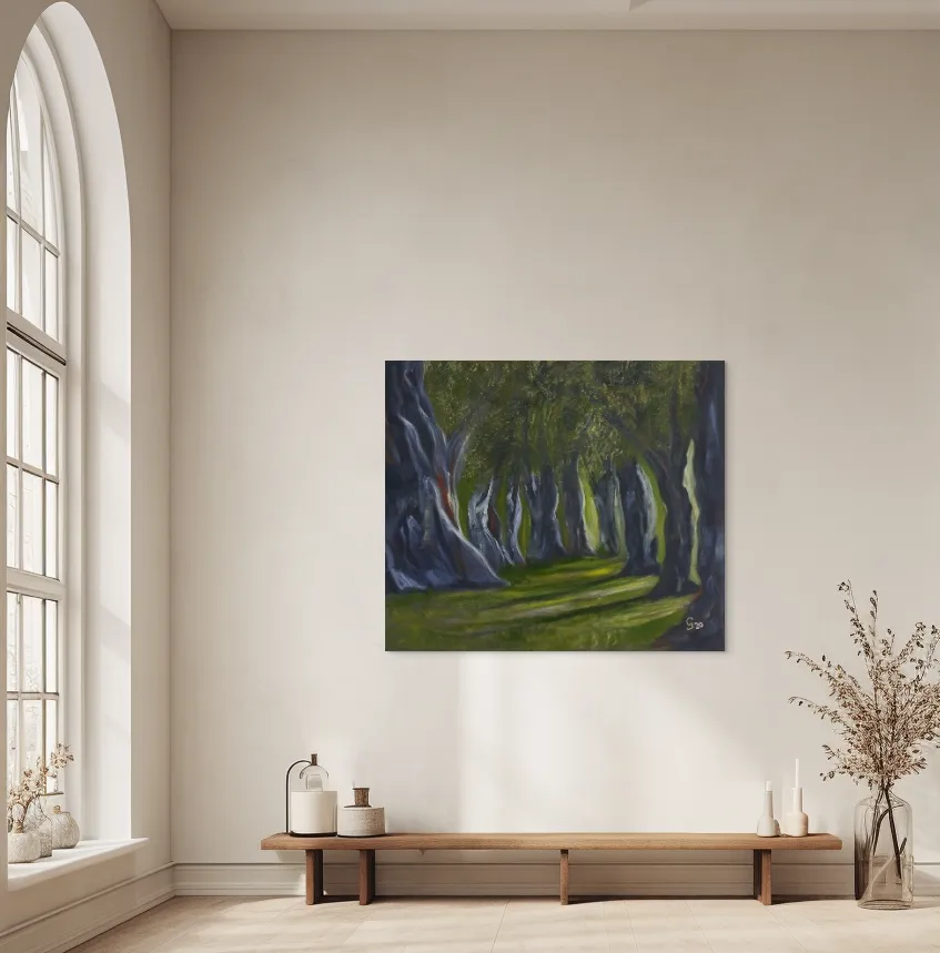 This painting evokes the hush of an ancient olive grove. Light filters through the leaves to a place between spaces, where the mind rests, and the spirit listens. The alla prima technique gives spontaneity, while layered glazes hint at the grove’s age and stillness. A glow of softly shifting light through the tree trunks draws the viewer into the heart of the composition, offering warmth and a sense of hope. It is a place remembered, where silence speaks, and the land holds its breath.