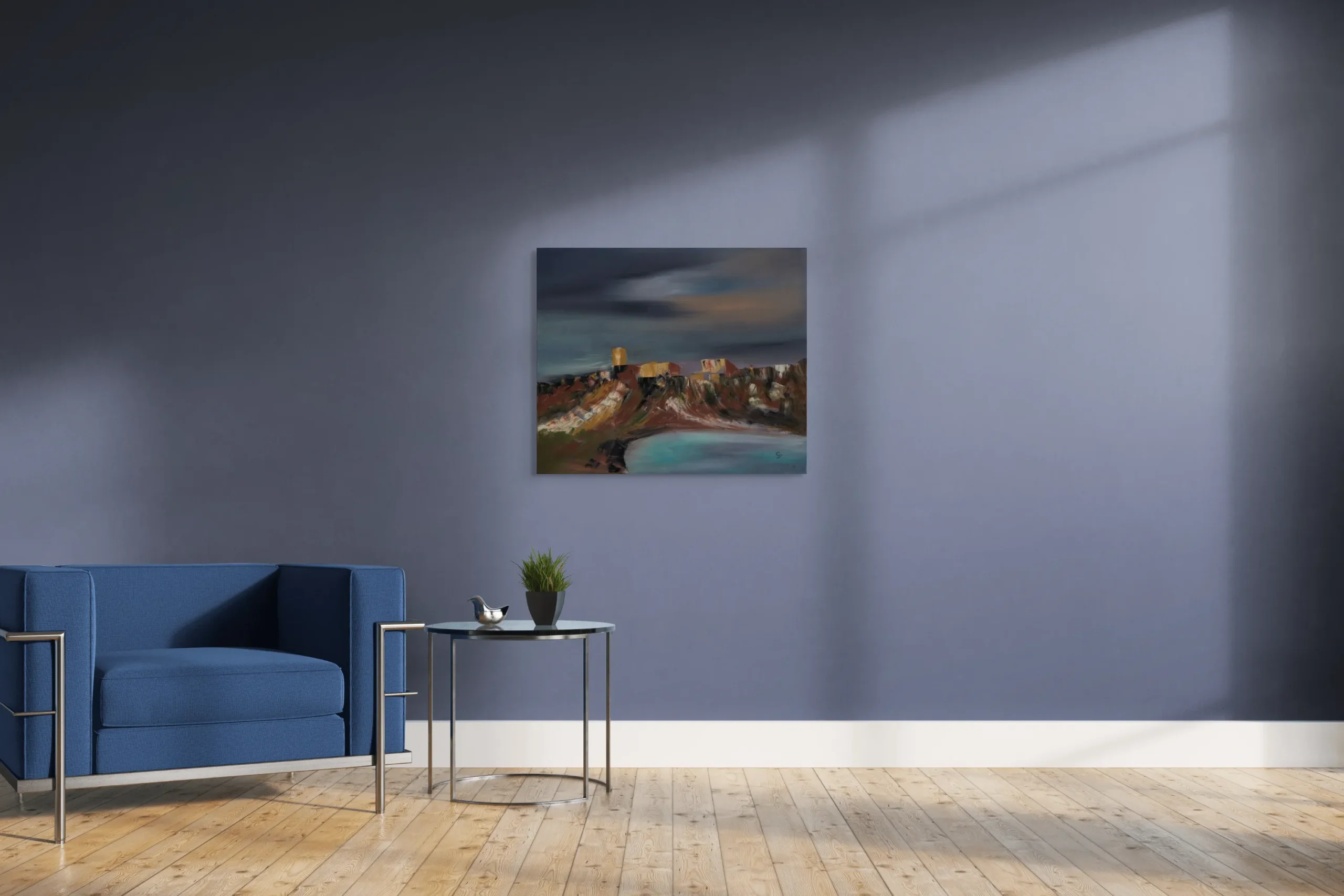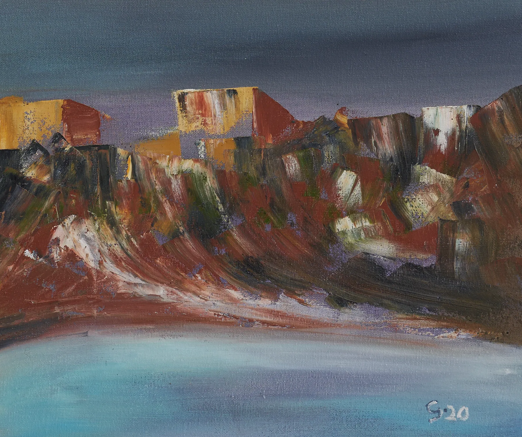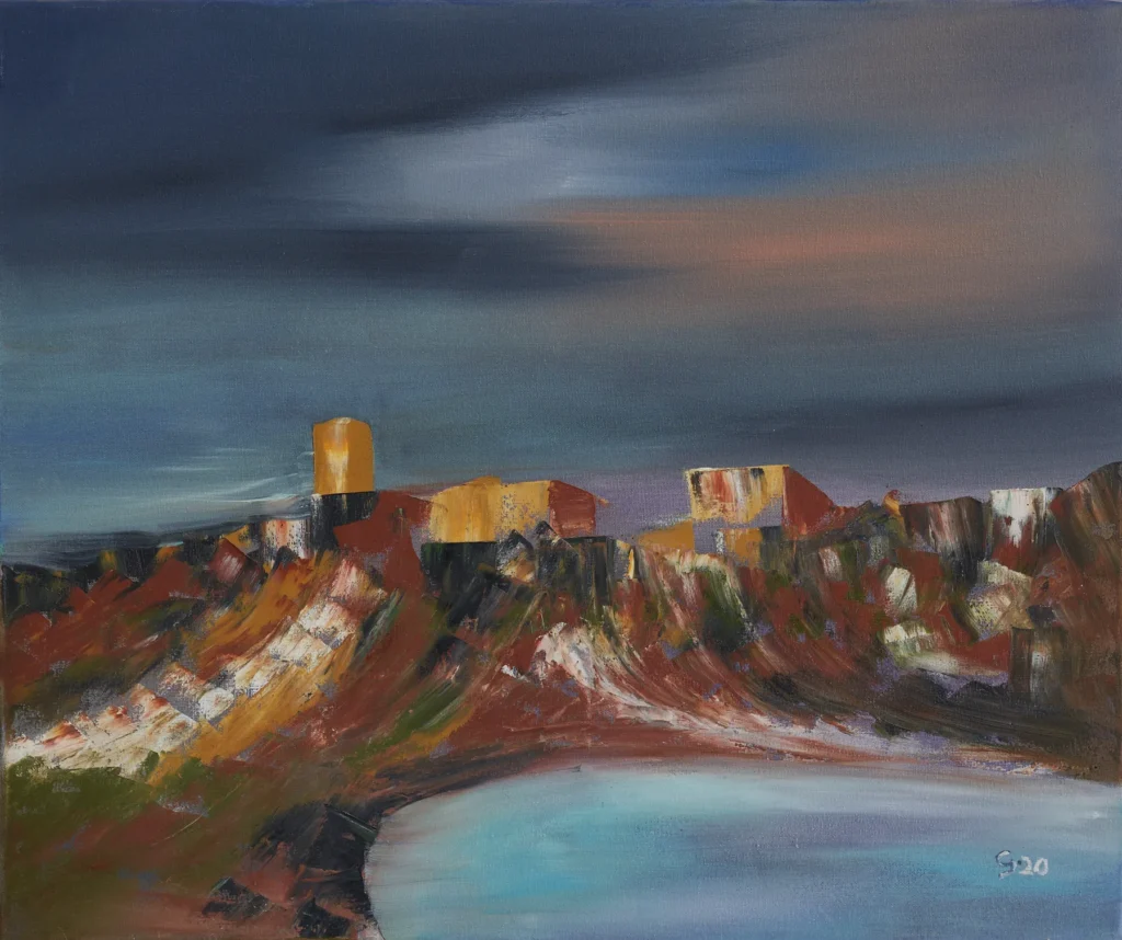 There is no precise geography here, only the quiet suggestion of place. This is not Tuscany as seen, but Tuscany as felt—its golden heat, its timeless rhythm. Sculpted with a palette knife, the textured surface suggests ancient cliffs and sun-drenched terraces worn smooth by wind and time. Ochres and siennas blend into cool shadows. The alla prima approach captures the fleeting quality of light, while subtle texture adds depth and movement. The scene invites reflection. This is not a literal view of Tuscany, but a meditation on its enduring presence, where nature and memory converge in quiet strength.